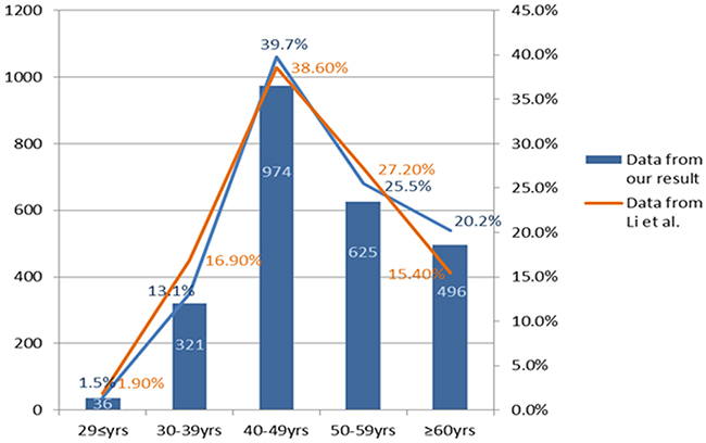 Figure 1: The age distribution of breast cancer patients at initial diagnosis with comparision of the data from Li et al [2].