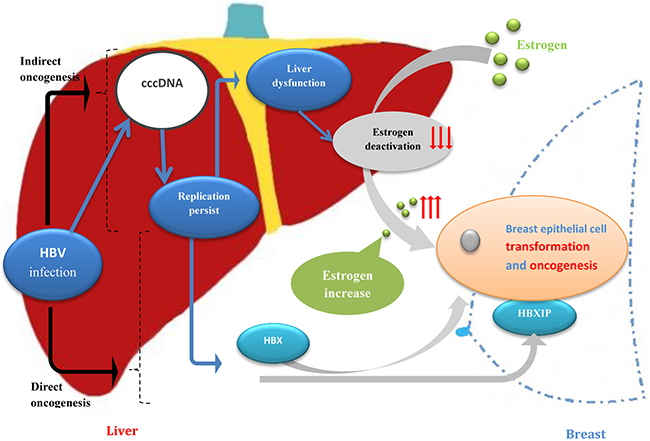 Cancer induction by HBV infection requires long periods of viral persistence usually covering for several decades [18]. Hepatocellular carcinoma (HCC) is well-known in the human neoplasms for being etiologically linked to HBV [19–21]. HBV infection can result in HBV replication without substantial liver injury for decades, but the risk of progression to cirrhosis and hepatocellular carcinoma maintained persistently over time [13]. Chronic HBV infection worldwide accounts for approximately 50% of all cases of hepatocellular carcinoma and virtually all childhood cases [19]. HBV X protein (HBX) interferes with cellular repair mechanisms may contribute to carcinogenesis [18]. Although the reasons of breast cancer promotion by HBV remain obscure and lack high-quality of epidemiological data, many researches in vitro have studied the function of HBX and hepatitis B X-interacting protein (HBXIP) on breast cancer cells [22–30]. Emerging evidence demonstrate that the HBX has been shown capable of transactivating many different viral and cellular promoters and high HBXIP expression was predominantly observed in breast cancer tissues instead of the adjacent normal breast tissues and HBXIP promotes the proliferation and migration of breast cancer cells and plays crucial roles in the development of breast cancer, serving as a key oncoprotein in cancer [22–30]. Furthermore, we presume a potential mechanism of indirect oncogenesis of breast epithelial cell caused by HBV infection: After HBV infection, HBV may persist as an occult infection and HBV replication may continue to cause a long-term subtle liver dysfunction [14–16]. Estrogen is mainly deactivated in liver and therefore estrogen may increase due to the result of liver dysfunction, while estrogen is a dominant risk factor of breast cancer, so final increase of gonadal hormone may promote the occurrence and development of breast cancer (Figure 2). In our result, the status of liver function in initially diagnosed breast cancer patients was significantly poorer than those in control group. Especially, all of albumin, ALT and AST were significantly poorer in 40-49 years old group, which was in accordance with HBcAb was significantly higher in 40-49 years old group. It suggest that the liver function of breast cancer patients was obviously poorer than controls at the time of initial diagnosis, which was in accordance with that potential mechanism of indirect oncogenesis of HBV infection on breast cancer. Certainly, various tumor related factors may also be related with liver dysfunction of breast cancer. This hypothesis was enlightened in our previous study about incidence of male breast cancer in Southwest of China, with a result that male breast cancer accounted for 1.96% to 6.5% (with the mean value of 2.9%) of breast cancers in Southwest of China from 2007 to 2011 and revealed that male breast cancer in Southwest of China was higher than that in United States(1%) [31]. So if oncogenesis of HBV in breast cancer functions through the impact on estrogen, and estrogen was also an important risk factor in the etiology of male breast cancer [32], males with an innate low-level of hormone may be more prone of having breast carcinoma through HBV infection than women. In addition, high HBV endemicity was more pronounced among males in china [33], so it is proved by our previous study that the rate of male breast cancer among all the breast cancers was relatively higher in Southwest of China [31].
