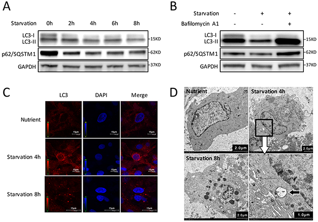 Figure 1: Autophagy is induced by starvation with EBSS in CMs. (A) Time course of autophagy activation stimulated by starvation. Western blot shows the LC3-I decreased while LC3-II increased during the first 4 hours and gradually recovered after starvation for 6 h. The degradation of p62/SQSTM1 increased gradually in the first 4 hours, then decreased gradually. (B) CMs were treated with Bafilomycin A1 and starved for 4 h. LC3-II accumulation was markedly increased, and p62/SQSTM1 degradation was blocked in Bafilomycin A1-treated groups. GAPDH was used as endogenous control. (C) The intracellular autophagosome and autolysosomes at 4 h starvation were probed by LC3 dots (red) for cell immunofluorescence. Nuclei were stained with DAPI (blue). (D) Transmission electron microscopy showed double-membraned autophagosomes formed in CMs at 4 h starvation (black arrow).