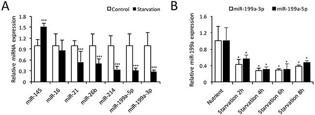 Figure 2: Expression of microRNAs in autophagic CMs. (A) Relative miRNA expression levels at 4 h starvation compared with control group. The expression levels of miR-199a-3p, miR-199a-5p, miR-21, miR-26b and miR-214 were decreased significantly. The relative miR-145 expression was increased, while miR-16 showed no significant change. The differences between two groups were analyzed using t-tests. (***P<0.001, n=3). (B) Cardiomyocytes were treated with EBSS for 2-8 h, qRT-PCR showed both miR-199a-3p and 199a-5p expressions were decreased significantly from 2 h up to 8 h. Dunnett’s t tests were used for comparison between groups. (*P<0.05 versus nutrient group, n=3). U6 small nuclear RNA was used as reference.