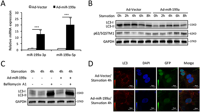 Figure 3: Overexpression of miR-199a blocks the autophagy activity in CMs. (A) After transfection with miR-199a overexpression adenovirus (Ad-miR-199a), the miR-199a-3p and miR-199a-5p expression levels were markedly up-regulated compared with cells infected with Ad-vector. The differences between two groups were analyzed using t-tests. (***P<0.001 versus Ad-vector, n=3) (B) Western blot showed that overexpression of miR-199a significantly suppressed LC3-II accumulation and p62/SQSTM1 degradation at starvation for 2-8 h. (C) After 48 h transfection, CMs were treated with Bafilomycin A1 and exposed to starvation for 4 h. Western blot shows reduced LC3-II levels in miR-199a overexpression CMs treated with or without Bafilomycin A1. GAPDH was used as endogenous control. (D) MiR-199a blocked starvation-induced autophagosomes formation. At 4 h starvation, confocal microscopy showed that the number of autophagosomes as represented by LC3 dots (red) was reduced in Ad-miR-199a group compared with Ad-vector group. Nuclei were stained with DAPI (blue). GFP: green fluorescent protein fused in adenovirus.