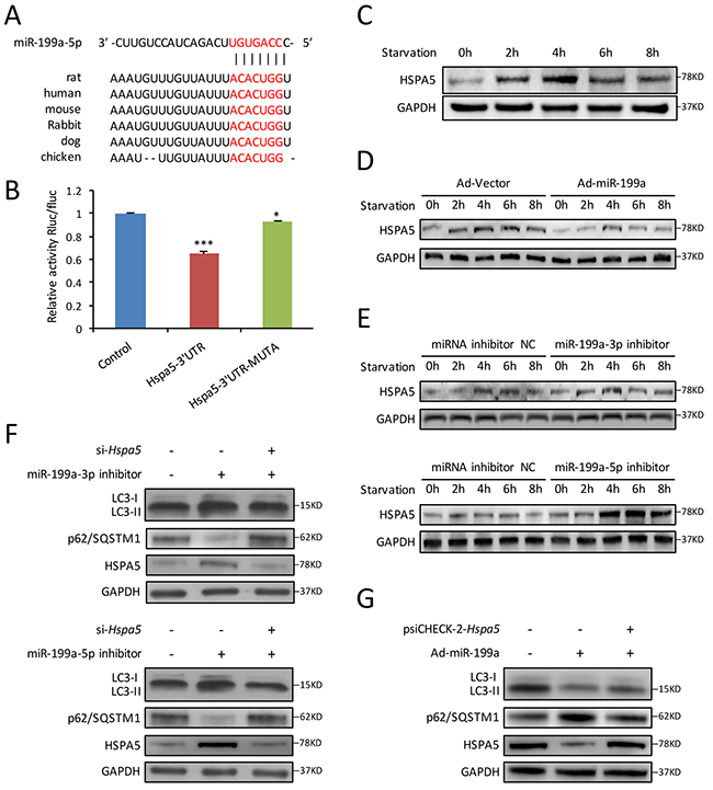 Figure 5: Hspa5 is identified as the target gene of miR-199a in CMs. (A) Using Targetscan algorithms, 3’ UTR of Hspa5 harbored a potential binding site of miR-199a-5p, which was conserved among different species. (B) Luciferase assay showed that overexpression of miR-199a-5p in 293T cells could significantly suppress the luciferase activity of a reporter fused with 3’UTR of Hspa5 mRNA. In cells transfected with psiCHECK-2-Hspa5 3’UTR-Mutant, there was less significant difference in the relative luciferase activity between cells treated with miR-199a-5p mimic and cells treated with a negative control. Dunnett’s t tests were used for comparison between groups. (*P<0.05, ***P<0.001 versus control, n=3). (C) Western blot shows HSPA5 protein levels in starved CMs were increased during the first 4 hours, then decreased after 6 h. (D) Forced overexpression of miR-199a in CMs significantly decreased the intracellular HSPA5 expression levels. (E) Knockdown of endogenous miR-199a-3p or miR-199a-5p markedly increased HSPA5 protein levels as shown by western blot. (F) Cardiomyocytes were co-tranfected with miR-199a-3p inhibitor or miR-199a-5p inhibitor and si-Hspa5. Knockdown of either miR-199a-3p or miR-199a-5p could promote LC3-II accumulation, p62/SQSTM1 degradation and HSPA5 protein expression after starvation for 4 h. Knockdown of Hspa5 counteracted the above effects. (G) Western blot showed that overexpression of Hspa5 recovered the inhibitory effect of miR-199a in starvation-induced CMs autophagy. GAPDH was used as endogenous control.