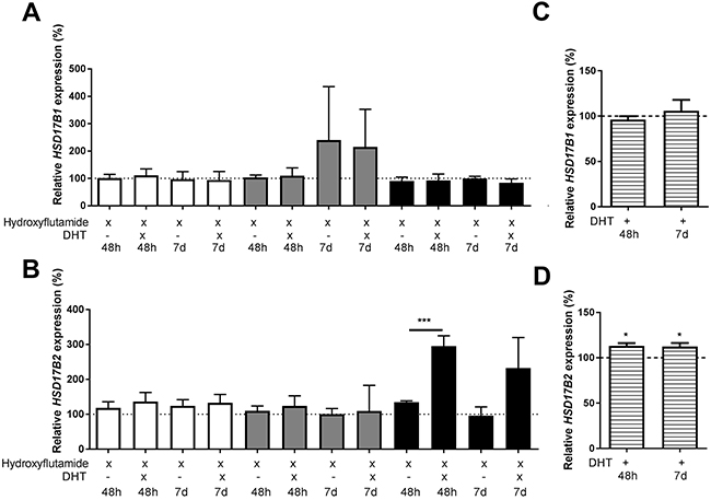Figure 4: Relative HSD17B1 (A, C) and HSD17B2 (B, D) expression. (A, B) denotes the effects of dihydrotestosterone in hydroxyflutamide treated ZR-75-1 (white), MCF7 (gray), and T-47D (black), at 48 hours and 7 days, n=3. (C, D) denotes the effect of dihydrotestosterone in SK-BR-3 (horizontal stripes), n=3. All effects of dihydrotestosterone on the relative HSD17B1 and HSD17B2 expression are compared to ethanol-treated controls from the same time point and cell line as the treated sample. Error bars represent standard derivation.