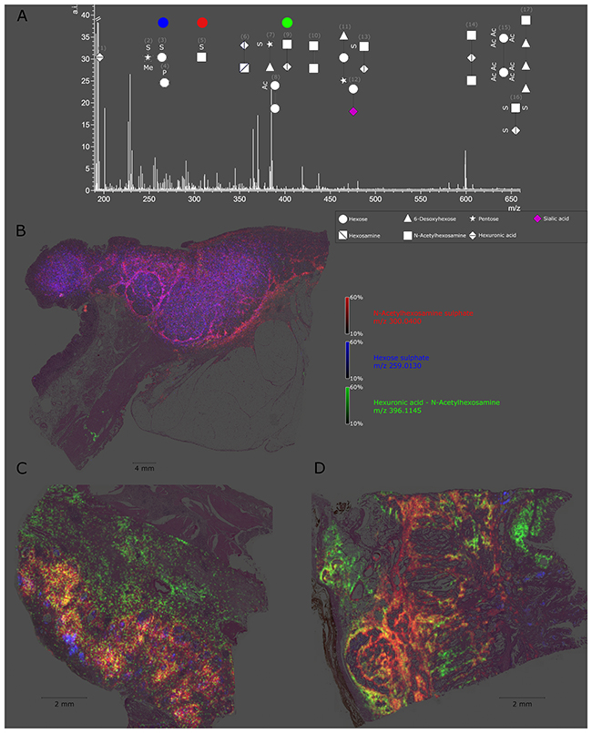 Figure 1: Detectable native glycan fragments and whole gastric cancer tissue section ion map. (A) Detectable glycan fragments were in the mass range of 190–660 m/z and are shown as symbols with numbers. The explanation of the symbols used (according to GlycoWorkbench) can be found in the caption in the right bottom corner. The numbers refer to Table 1. (B-D) Ion map of N-acetylhexosamine sulphate, hexose sulphate, and hexuronic acid N-acetylhexosamine in whole tissue sections from a gastric cancer patient. Every tissue section corresponds to an individual patient and highlights altered specific distribution of each glycan fragment.