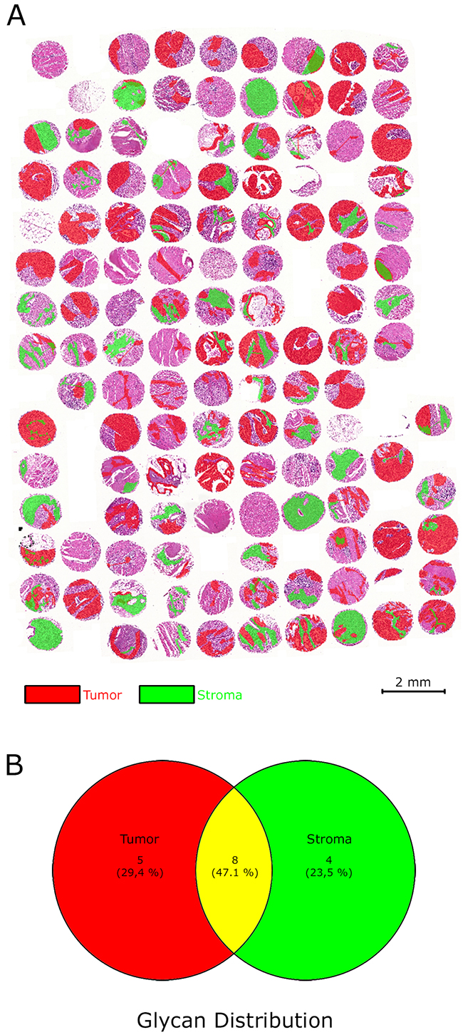 The MALDI-FT-ICR MSI analysis of a TMA, consisting of samples from 106 gastric cancer patients, resulted in the annotation of 17 native glycans amongst approximately 2000 m/z species over a mass range of 50–800 m/z (Table 1). Distinct localization patterns of these glycan fragments were observed in whole tissue sections of individual patients (Figure 1) and between patients on the TMA (Figure 2) which illustrates the variability in abundance among the fragments. Examples of glycans with distinct distribution patterns are shown in Figure 2. A distinction between non-sulphated/sulphated and non-acetylated/acetylated residues was, likewise, associated with differential distribution patterns (Figure 2). Looking at the histology of the tissues showed that each glycan could be assigned to a specific tissue compartment (e.g. tumor cells and/or tumor stroma, Figure 3A). Five glycans were present only in the tumor cell regions and four were only detected in the tumor stroma, whereas eight glycans were present simultaneously in both the tumor cell regions and the tumor stroma (Figure 3B). Based on available databases and literature, the origins of four of the glycans detected were O-linked glycans, two were N-linked glycans, and 10 were glycosaminoglycan structures [2, 3].
