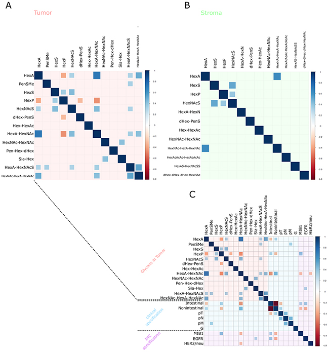 Further statistical testing for associations of the glycan abundances to the clinical data (Table 3), and therapeutic target expression levels was investigated using the Spearman’s rank correlation. Correlation-plots and calculations were generated and performed within R (‘corrplot‘ package).