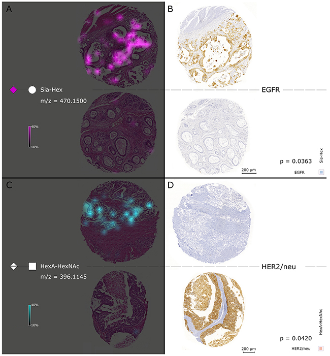 Figure 6: Simultaneous consideration of MALDI FT-ICR-MSI and results of the EGFR and HER2/neu immunohistochemical staining. The left cores in (A) show the Sia-Hex ion map of two individual patients. Sia-Hex was positively correlated with EGFR. High abundances of Sia-Hex were observed in accord with high EGFR expression, as indicated in the immunohistochemical staining with EGFR in the two right cores in (B). In contrast, (C) contains the HexA–HexNAc ion map, which was negatively correlated with HER2/neu expression. High HexA–HexNAc mass intensities were accompanied by low expression of HER2/neu, which can be observed in (D).