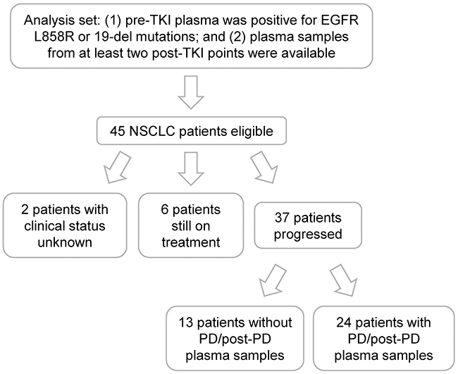 NSCLC patients were included in the analysis set if (1) their pre-TKI plasma was positive for EGFR L858R or 19-del mutations; and (2) they had plasma samples from at least two post-TKI points (Figure 1). In total, 45 patients were eligible and their clinical characteristics were described in Table 1. The median age for this cohort was 58 with the range of 37-77 and over half were female. Adenocarcinoma, stage IV, non-smoker, and first-line gefitinib treatment occupied the majority of the population. Twenty-eight patients had pre-TKI plasma samples with 19-del, 16 with L858R, and one with L858R & 19-del dual mutations. Concordant plasma and tissue EGFR mutation testing results were found in 42 patients (Supplementary Table 1). By the data cut-off date, 6 patients were still on treatment and 37 reached progressive disease (PD) (Figure 1). Serial plasma samples were taken throughout TKI treatment for each patient with most post-TKI samples collected at 1- and 3-month (Supplementary Figure 1). A total of 210 plasma samples were used for analysis of EGFR mutations.