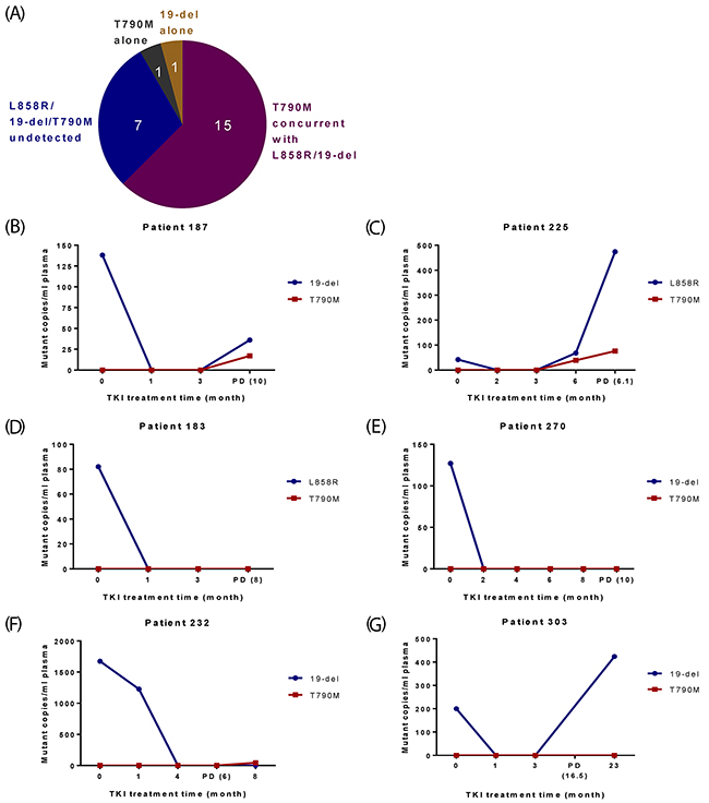 Figure 2: Profiles of EGFR mutations in plasma for 24 NSCLC patients who progressed. (A) Categories of EGFR mutation status in plasma at/after PD. (B-G) Representative results from patients in different categories. X-axis is TKI treatment time and Y-axis is EGFR mutant copies per ml of plasma. (B-C) Two patients initially carried 19-del/L8589R and eventually developed T790M concurrently with 19-del/L858R. (D-E) Two patients initially carried 19-del/L858R, but “lost” EGFR mutations at PD. (F) One patient showed T790M only after PD. (G) One patient carried 19-del alone after PD.