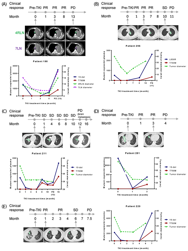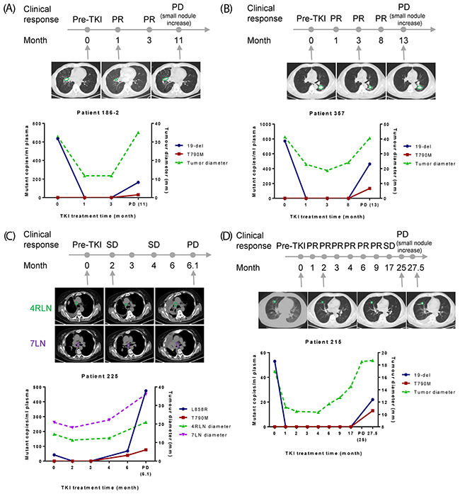 For patient 477 (Supplementary Figure 4B), 19-del and T790M were detected at 10-month post-TKI with the tumor diameter rebounded close to that of pre-TKI point, though PD was not reached yet.