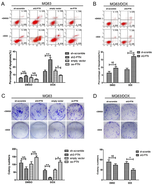 Figure 4: PTN promotes apoptosis resistance and colony formation in OS cells treated with DOX. (A, B) PTN expression had no effect on the apoptosis of MG63 (A) and MG63/DOX (B) cells treated with DMSO. PTN knockdown promoted apoptosis in MG63 (A) and MG63/DOX (B) cells treated with DOX, while PTN overexpression inhibited apoptosis in MG63 cells treated with DOX. (C, D) PTN expression had no effect on the clone formation of MG63 (C) and MG63/DOX (D) cells treated with DMSO. PTN knockdown inhibited the clone formation of MG63 (C) and MG63/DOX (D) cells treated with DOX, while PTN overexpression promoted the clone formation of MG63 cells treated with DOX. *, p<0.05; **, p<0.01. PTN: pleiotrophin; OS: osteosarcoma; DOX: doxorubicin; sh: short hairpin; oe: overexpression. NS: not significant.