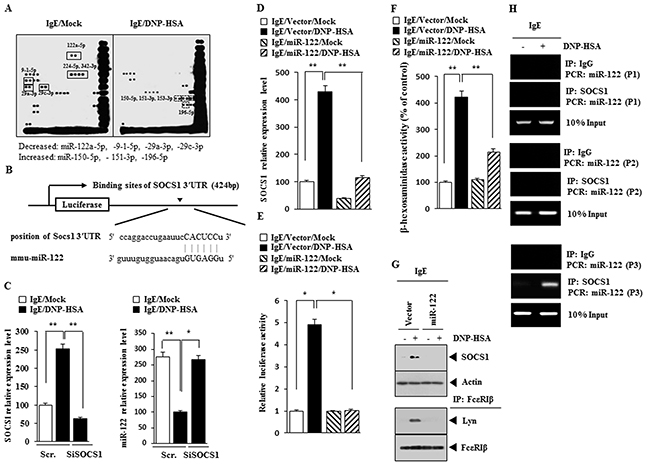 Figure 4: miR-122-SOC1 negative feedback loop regulates the allergic inflammation. (A) The IgE-sensitized RBL2H3 cells were treated with DNP-HSA for 1 h, followed by miRNA array analysis. (B) Shows the potential binding site of miR-122 to 3′UTR-SOCS1. (C) RBL2H3 cells were transfected with scrambled siRNA or SOCS1 siRNA. The next day, cells were sensitized with IgE for 24 h, followed by stimulation with DNP-HSA. One hour after stimulation with DNP-HSA, cell lysates were subjected to qRT-PCR analysis. *, p<0.05; **, p<0.005. (D) Same as (C) except that RBL2H3 cells were transfected with control vector or miR-122 vector. **, p<0.005. (E) Same as (D) except that luciferase activity assays were performed. *, p<0.05. (F) Same as (E) except that β-hexosaminidase activity assays were performed. **, p<0.005. (G) Same as (F) except that western blot and immunoprecipitation were performed. (H) The IgE-sensitized RBL2H3 cells were treated with DNP-HSA for 1h, followed by ChIP assays. P1, P2 and P3 denote region of miR-122 promoter amplified by primer 1, 2 and 3, respectively.