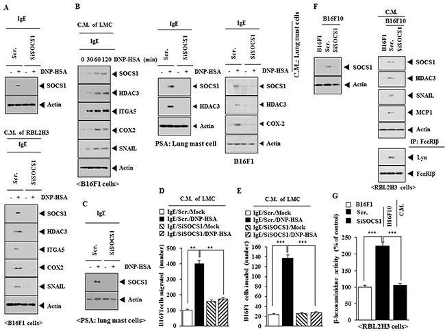 Figure 5: SOCS1 mediates the interaction between cancer cells and mast cells. (A) RBL2H3 cells were transfected with scrambled siRNA or SOCS1 siRNA. The next day, cells were sensitized with IgE for 24 h, followed by stimulation with DNP-HSA for 1 h. cell lysates were subjected to western blot (upper panel). RBL2H3 cells were transfected with scrambled siRNA or SOCS1 siRNA. The next day, cells were sensitized with IgE for 24 h, followed by stimulation with DNP-HSA. One hour after stimulation with DNP-HSA, conditioned medium was obtained and added to B16F1 cells for 8 h, followed by western blot (lower panel). (B) The IgE-sensitized lung mast cells were stimulated with DNP-HSA for various time intervals. The conditioned medium obtained at each time point was added to B16F1 cells for 8 h, followed by western blot analysis. Animal model of PSA was performed in the absence or presence of SOCS1 siRNA (100 nM). Western blot analysis was performed employing lung mast cells. The conditioned medium of lung mast cells was obtained and added to B16F1 cells for 8 h, followed by western blot. (C) BALB/c mice were injected intravenously with scrambled siRNA (100 nM) or SOCS1 siRNA (100 nM). The next day, BALB/c mice were injected intravenously with IgE (0.5 μg/kg). The following day, BALB/c mice were injected intravenously with DNP-HSA (250 μg/kg). Lung mast cell lysates were subjected to western blot analysis. (D) The conditioned medium of lung mast cells obtained after PSA was added to B16F1 cells and wound migration assays were performed. **, p<0.005. (E) Same as (D) except that chemoinvasion assays were performed. ***, p<0.0005. (F) B16F10 cells were transfected with the indicated siRNA. At 48 h after transfection, western blot was performed (upper panel). The indicated cancer cells were transfected with the indicated siRNA. The conditioned medium was added to RBL2H3 cells for 8 h, followed by immunoprecipitation and western blot analysis. (G) Same as (F) except that β-hexosaminidase activity assays were performed. ***, p<0.0005.