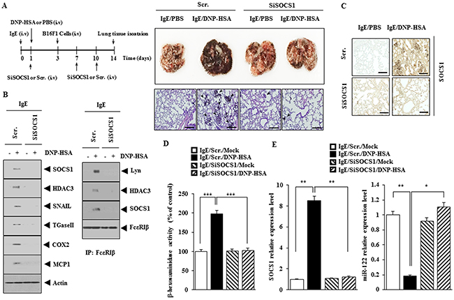 Figure 6: SOCS1 is necessary for the enhanced metastatic potential of cancer cells by allergic inflammation. (A) BALB/C mice were sensitized to IgE (0.5 μg/kg) by an intravenous injection. The next day, BALB/C mice were given an intravenous injection of DNP-HSA (250 μg/kg). Each mouse received an injection of B16F1 melanoma cells (2 X 105) on the day 3 of the time line. BALB/C mice were given an intravenous injection with the indicated siRNA (100 nM) on days 1, 7, and 10 of the time line. On day 14 of the time line, lung tissues were harvested. Formalin-fixed lung sections were stained with H&E. Black arrows denote lung metastatic foci (scale bar, 100 μm). The extent of lung metastasis was determined as described. (B) Lung tumor tissue lysates from each mouse of each experimental group of mice were subjected to western blot and immunoprecipitation. (C) Immunohistochemical staining of lung tumor tissue was performed (scale bar, 100 μm). (D) Lung tumor tissue lysates were subjected to β-hexosaminidase activity assays. ***, <0.0005. (E) Same as (D) except that qRT-PCR analysis was performed. *, p<0.05; **, p<0.005.