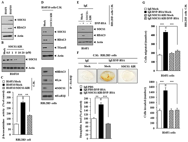 Figure 10: SOCS1-KIR inhibits cellular interaction during allergic inflammation-promoted tumorigenesis. (A) Western blot was performed. (B) B16F10 cells were treated with various concentrations of SOCS1-KIR for 24 h, followed by western blot. (C) The conditioned medium of B16F10 cells, treated with SOCS1-KIR for 24 h, was added to RBL2H3 cells for 24 h, followed by β-hexosaminidase activity assays. **, p<0.005; ***, p<0.0005. (D) The conditioned medium of B16F10 cells, treated with SOCS1-KIR for 24 h, was added to RBL2H3 cells for 24 h, followed by western blot and immunoprecipitation. (E) The conditioned medium of antigen-stimulated RBL2H3 cells treated with or without SOCS1-KIR (5 μM) for 2 h was added to B16F1 cells for 24 h, followed by western blot analysis. (F) The conditioned medium of antigen-stimulated RBL2H3 cells treated with or without SOCS1-KIR (5 μM) for 2 h was subjected to matrigel plug assays. **, p<0.005; ***, p<0.0005. (G) The indicated conditioned medium of RBL2H3 cells was added to B16F1 cells. Invasion and migration potential of B16F1 cells were determined. ***, p<0.0005.