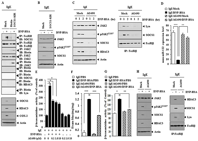 SOCS1-KIR binds to JAK2 and exhibits anti-inflammatory activity [17], therefore the effect of JAK2 on allergic inflammation was investigated. SOCS1-KIR inhibited the interaction between FcεRIβ and SOCS1 in antigen-stimulated RBL2H3 cells (Figure 12A). Biotin-SOCS1-KIR bound to JAK2 (Figure 12A), but not to HDAC3, SOCS1 or Lyn (Figure 12A). Biotin-SOCS1-KIR decreased the expression of SOCS1, HDAC3 and COX-2 in antigen-stimulated RBL2H3 cells (Figure 12A). SOCS1-KIR prevented antigen from increasing the expression of pJAK2Y1007 (Figure 12B). An inhibitor of JAK2 (AG490) prevented antigen from increasing the expression of SOCS1, HDAC3 and pJAK2Y1007 and interactions of FcεRIβ with Lyn and SOCS1 in RBL2H3 cells (Figure 12C). AG490 also prevented antigen form increasing the expression of pSTAT1Y701 and pSTAT3Y705 (data not shown). AG490 restored the expression of miR-122 in RBL2H3 cells (Figure 12D) and prevented antigen from increasing β-hexosaminidase activity (Figure 12E). AG490 prevented antigen from increasing vascular permeability (Figure 12F) and prevented antigen from increasing β-hexosaminidase activity in a mouse model of PCA (Figure 12G). AG490 prevented antigen from increasing the expression of pJAK2Y1007, HDAC3 and SOCS1 and prevented antigen from inducing an interactions of FcεRIβ with HDAC3, SOCS1 and Lyn in a mouse model of PCA (Figure 12H). These results indicate that the miR-122-SOCS1-JAK2 axis regulates allergic inflammation.