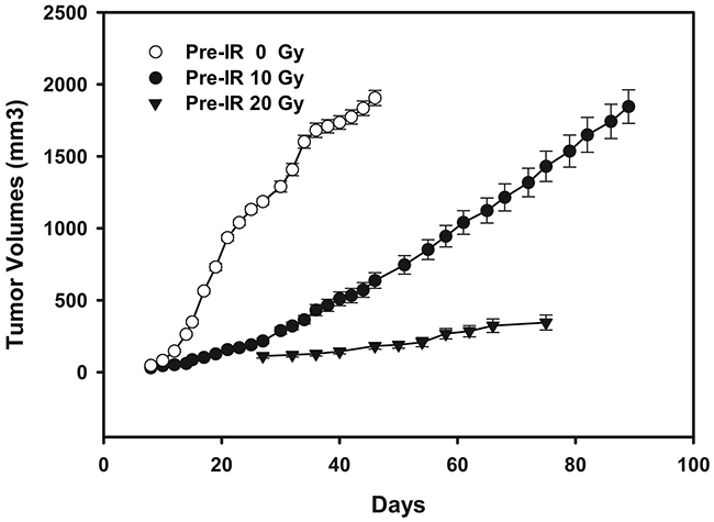 Figure 1: Tumor growth curves of mice (n = 10/group) inoculated with ECA109 cells 24 hours after the 0 Gy, 10 Gy and 20 Gy pre-irradiation to the right hind leg. Tumors from 10 Gy and 20 Gy pre-irradiated mice grew significantly slower than those in 0 Gy pre-irradiated group (P=0.005 for 10 Gy vs 0 Gy pre-irradiation; P<0.001 for 20 Gy vs 0 Gy pre-irradiation). As for exposure dose, growth delay was much more significant in mice with 20 Gy pre-radiation than those with 10 Gy (P=0.002).