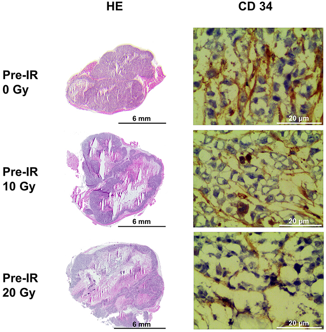 Figure 2: HE staining and CD34 immunohistochemical staining of tumors in the 0 Gy, 10 Gy and 20 Gy pre-irradiation models. The necrotic fractions derived from HE staining increased as pre-irradiation dose increasing (P<0.001). Specific staining of capillary-like vessels by anti-CD34 showed significant decrease of intra-tumoral microvessel density (MVD) in 10 Gy and 20 Gy pre-irradiation compared with 0 Gy pre-irradiation (P=0.016). MVD in tumor was negatively correlated with the necrotic fractions (r=-0.751,P=0.005).