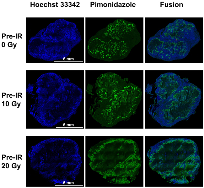 Figure 3: Pimonidazole, Hoechst 33342 and fusion images of tumors in the 0 Gy, 10 Gy and 20 Gy pre-irradiation models. Pimonidazole binding was primarily confined to peri-necrotic regions while Hoechst 33342 binding located at outer edge of tumor. There was a tendency for intratumoral regions staining positive for pimonidazole or for Hoechst 33342 to be mutually exclusive. A significant higher pimonidazole-positive fraction and lower Hoechst-positive fraction were seen in tumors of 10 Gy and 20 Gy pre-irradiation models than 0 Gy pre-irradiation models (P=0.010, P=0.018).