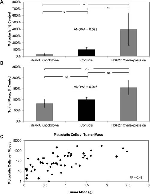 Figure 3: HSP27 increases PCa metastasis as well as tumor growth. Cohorts of ten mice were orthotopically implanted with HSP27-WT-H1, HSP27-WT-H2, VC-1, VC-2, shHSP27-1, shHSP27-2, shCO-1 or shCO-2 cells. The resultant number of distant metastases (A) and tumor mass (B) were then measured. Data from HSP27-WT-H1 and HSP27-WT-H2 cohorts were combined, giving a HSP27 overexpression cohort (20 mice), that of VC-1, VC-2, shCO-1 and shCO-2 cohorts combined, giving a control cohort (40 mice) that was normalized to 100%, and that from shHSP27-1 and shHSP27-2 cohorts combined, giving a shRNA knockdown cohort (20 mice), Data are the mean ± SEM number of metastatic cells (A) and tumor mass (B) per mouse, normalized to controls. * denotes two-tailed Fisher’s exact test p<0.05, ns denotes two-tailed Fisher’s exact test p>0.05. (C) The graph depicts the number of metastatic cells plotted against the tumor mass for each mouse. The coefficient of determination (R2) between these two parameters was determined, and is depicted.