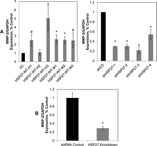 Figure 7: HSP27 regulates MMP-2 gene expression. (A) HSP27 regulates MMP-2 gene expression in vitro. The expression of MMP-2 in HSP27 stable clones was measured by qRT/PCR normalized to GAPDH, as in figure 1C, and expressed relative to control clones (normalized to 1.0). Data represent the mean ± SEM from at least two independent experiments performed in replicates of N=2; *, p<0.05 by two-tailed student’s t-test compared to controls; #,p<0.05 by one-tailed student’s t-test compared to controls. (B) HSP27 regulates MMP-2 gene expression in vivo. MMP-2 gene expression levels in mouse prostate tumor samples was measured as in (A). Data represents average MMP-2 gene expression ± SEM of at least 2 independent experiments, normalized to GAPDH, and expressed relative to shRNA control cells normalized to 1.0. *, p<0.05 compared to controls.