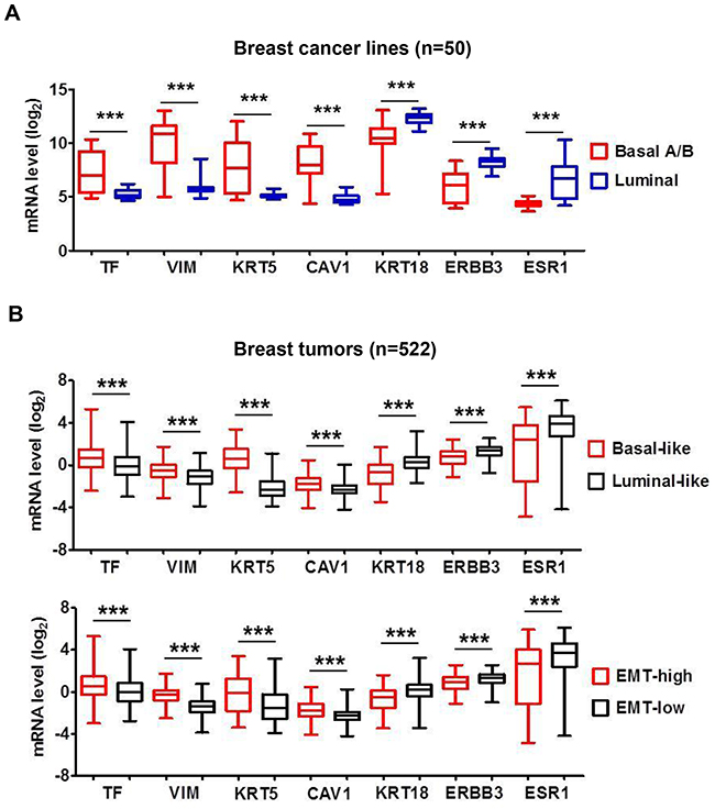 Figure 2: Breast cancer TF mRNA level correlates with “Basal-like” and “EMT-high” signature. (A) The panel of 50 breast cancer cell lines as in Figure 1A was analyzed employing the Affymetrix array data file (36). Representative mRNA levels of the indicated genes in the 50 cell lines were analyzed and plotted. Vimentin (VIM), keratin-5 (KRT5) and caveolin-1 (CAV1) are representative Basal-markers, while keratin-18 (KRT18), ERBB3 and ESR1 are representative Luminal-markers. (B) Affymetrix array data for 522 breast tumors [37] were sorted into “Basal-like” vs. “Luminal-like” or “EMT-high” vs. “EMT-low” based on mRNA expression ratio (KRT5 plus KRT14)/(KRT8 plus KRT18) [38] or vimentin/E-cadherin [39], respectively. Median values of the datasets served as group cutoff. Representative mRNA levels for TF, VIM, KRT5, CAV1, KRT18, ERBB3 and ESR1 were analyzed and compared between “Basal-like” vs. “Luminal-like” tumors (top panel) or “EMT-high” vs. “EMT-low” tumors (bottom panel), respectively. ***, P<0.001.