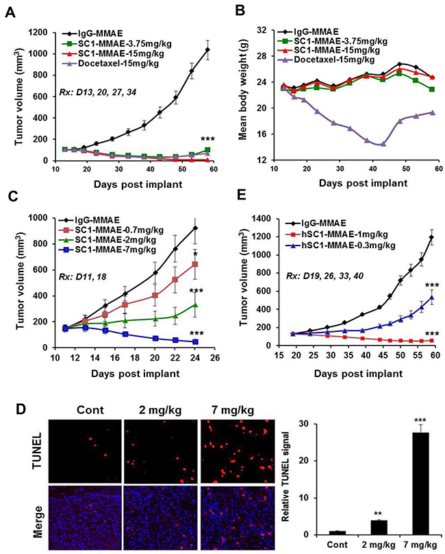 Nude mice bearing established BxPC3 tumors were treated 1x weekly with IgG-MMAE, SC1-MMAE or docetaxel for 4 weeks. SC1-MMAE elicited a substantial (3.75 mg/kg) or complete tumor regression (15 mg/kg) (Figure 8A). While 15 mg/kg docetaxel showed a similar tumor inhibition as 3.75 mg/kg SC1-MMAE, it caused a severe body weight loss (Figure 8B). Similar treatment of HCC1806-bearing mice with SC1-MMAE for 2 weeks documented a partial to complete tumor inhibition at 0.7 to 2 mg/kg and a nearly complete tumor regression at 7 mg/kg (Figure 8C). TUNEL staining showed that there was a significant increase in apoptosis in HCC1806 tumor tissue in the mice treated with 2 and 7 mg/kg SC1-MMAE (Figure 8D). We developed a humanized SC1 (hSC1; IgG1κ) and its MMAE conjugate (hSC1-MMAE). The unconjugated hSC1 retained full TF-binding affinity in vitro (Figure 3A, Supplementary Figure 5A) and in vivo antitumor activity compared to SC1 (Figure 6B, Supplementary Figure 5B). 1x weekly treatment with hSC1-MMAE resulted in a substantial inhibition (0.3 mg/kg) or a nearly complete regression (1 mg/kg) of established BxPC3 tumors (Figure 8E). Together these results indicate that SC1/hSC1-MMAE is a potent antitumor agent in vivo and can be potentially developed as targeted therapy for treating TF-positive TNBC and PaC.
