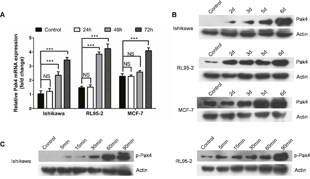 ER-positive human Ishikawa and RL95-2 endometrial cancer cells, as well as estrogen-responsive breast cancer MCF-7 cells were treated with a low-dose E2 (10 nM). We observed that E2 treatment led to a time-dependent increase in both Pak4 mRNA and protein levels (Figure 1A and 1B). In Ishikawa cells, the Pak4 protein levels started to rise after 2 days, and gradually peaked in 6 days. Similar trends were also found in RL95-2 cells. As for MCF-7 breast cancer cells, the levels of Pak4 mRNA and protein increased after 3 days of E2 stimulation.