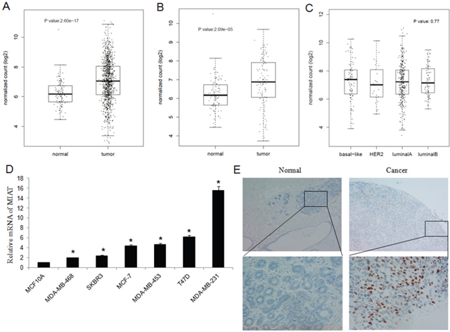 Figure 1: Expression of MIAT in TCGA, breast cancer cell lines and tissues. (A) MIAT expression was higher in breast cancer tissues than in normal breast tissues from TCGA dataset (P<0.05). (B) MIAT expression was higher in breast cancer tissues than in paired normal breast tissues from TCGA dataset (P<0.05). (C) There were no significance of MIAT expression among different breast cancer subtypes from TCGA dataset (P=0.77). (D) MIAT expression was higher in breast cancer cell lines than in normal breast epithelial cell line MCF-10A. *P <0.05, Two-side Student’s t-test; n = 3. (E) RNA Scope® technology detection showed that MIAT RNA was significant overexpression in human breast cancer tissues than in adjacent normal tissues (up ×100; bottom ×400).