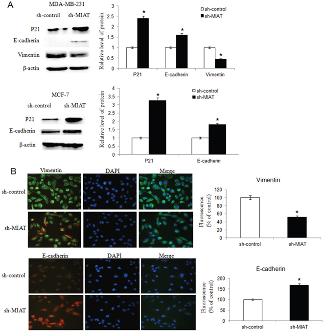 Figure 4: MIAT downregulation inhibited breast cancer cell EMT. (A) Western blot analysis showed that knockdown of MIAT increased P21 and E-cadherin expression both in MDA-MB-231 and MCF-7 cells. The vimentin level was inhibited in MDA-MB-231 cell after MIAT knockdown but no vimentin was found in MCF-7 cell (data not shown). β-actin was detected as the loading control. *P <0.05, Two-side Student’s t-test; n = 3. (B) Immunofluoresence assay was conducted to detect vimentin and E-cadherin expression in MDA-MB-231 cells. The expression of vimentin was lower but E-cadherin was higher in cells transfected with sh-MIAT than in sh-control cells. Nuclei, blue; vimentin (up) or E-cadherin (bottom), green; Cells transfected with lentivirus, red (×400). Results were presented as a relative percentage to control (defined as 100%). *P <0.05, Two-side Student’s t-test; n = 3.