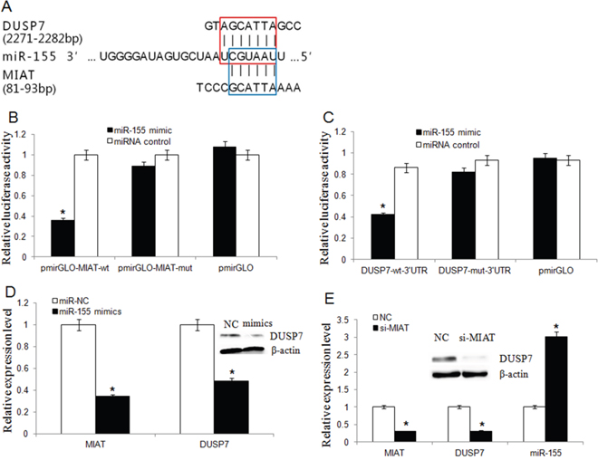 Figure 6: MIAT and DUSP7 shared a common miR-155-5p binding site. (A) Bioinformatics analysis revealed that MIAT and DUSP7 shared a common miR-155-5p binding site. The red box represented the binding site for miR-155-5p on the DUSP7 mRNA 3′-UTR, and the blue box represented the binding site for miR-155-5p on MIAT. (B) Luciferase activity in HEK293T cells cotransfected with miR-155-5p mimics and luciferase reporters containing control vector, pmir-Glo-MIAT-wt and pmir-Glo-MIAT-mut (*P<0.05, Two-side Student’s t-test; n = 3). miR-155-5p mimics reduced the luciferase activity of wt MIAT reporter vector but not that of mut MIAT reporter vector. (C) MiR-155-5p significantly inhibited the luciferase activity of the DUSP7 wt 3′-UTR but not that of the mutant (*P <0.05, Two-side Student’s t-test; n = 3). (D) MiR-155-5p overexpression downregulated the endogenic MIAT and DUSP7 expression. (*P <0.05, Two-side Student’s t-test; n = 3). Western blot assay showed that miR-155-5p overexpression silenced DUSP7 protein expression. (E) The miR-155-5p level was increased but DUSP7 mRNA level was decreased in MDA-MB-231 cells after MIAT knockdown. (Data are presented as mean ± SD, n=3. *P <0.05). Western blot assay showed that knockdown of MIAT triggered a significant silencing effect on endogenous DUSP7 protein.