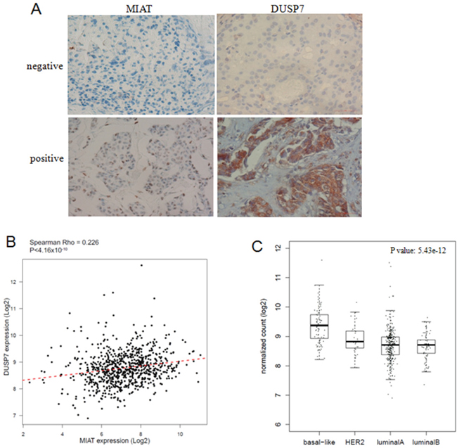 Figure 7: MIAT and DUSP7 had positive association. (A) Consecutive sections of MIAT and DUSP7 expression in breast cancer TMA. MIAT RNA was detected by RNA Scope 2.0® technology and DUSP7 protein was detected by IHC (×400). MIAT located at nucleus and DUSP7 located at cytoplasm. (B) The linear correlations between the expression level of MIAT and DUSP7 in breast cancer tissues from TCGA database (R=0.226, P<0.05). The data were obtained using the logistic regression analysis. (C) The DUSP7 expression was higher in basal-like breast cancer subtypes from TCGA database (P<0.05).