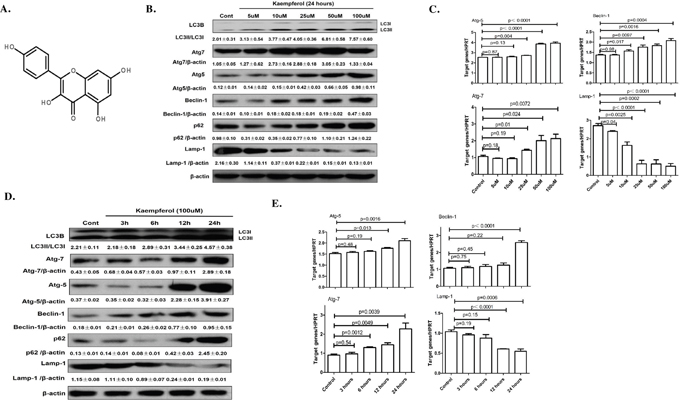 Figure 1: Dose- and time-dependent effects of kaempferol on protein and mRNA levels of autophagy-related genes. (A) Chemical structure of kaempferol. (B) For dose-dependent effects, HepG2 cells were treated in the presence or absence of different concentrations of kaempferol for 24 h. The protein expression levels of Atg5, Atg7, Beclin1 and LC3B were measured by western blot. Data are expressed as mean ± SD of at least three independent experiments. (C) For dose-dependent effects, HepG2 cells were treated in the presence or absence of different concentrations of kaempferol for 24 h. The mRNA expression levels of Atg5, Atg7, Beclin1 and Lamp1 were measured by qRT-PCR. Data are expressed as mean ± SD of at least three independent experiments. (D) For time-dependent effects, HepG2 cells were exposed to 100 μM kaempferol for different time periods. The protein expression levels of Atg5, Atg7, Beclin1 and LC3B were measured by western blot. Data are expressed as the mean ± SD of at least three independent experiments. (E) For time-dependent effects, HepG2 cells were exposed to 100 μM kaempferol for different time periods. The mRNA expression levels of Atg5, Atg7, Beclin1 and Lamp1 were measured by qRT-PCR. Data are expressed as mean ± SD of at least three independent experiments.