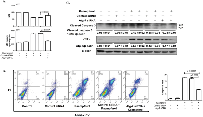 Figure 3: Knockdown of Atg7 with siRNA decreases kaempferol-induced death in HepG2 cells. Data are expressed as mean ± SD of at least three independent experiments. (A) Cell viability was measured by MTT assay and cell death was measured by LDH activity analysis. (B) Apoptotic rate was determined using flow cytometry and quantified the apoptotic rate. (C) Protein expression levels of cleaved caspase3 and β-actin were determined using western blot and quantified by densitometry.