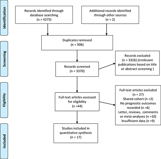 Two investigators (Z.Y. and B.Y.) independently screened all study titles and/or abstracts and excluded non-original studies including letters, reviews, case reports, comments and studies without sufficient data for analysis. We did not include non-English-language studies due to the low study quality and insufficient data for analyses. In case of disagreement among the investigators, joint revision was performed by two senior authors (W.L. and K.L.) until consensus was achieved. As is shown in Figure 1, the flowdiagram of study selection summarizes how we identify eligible studies.