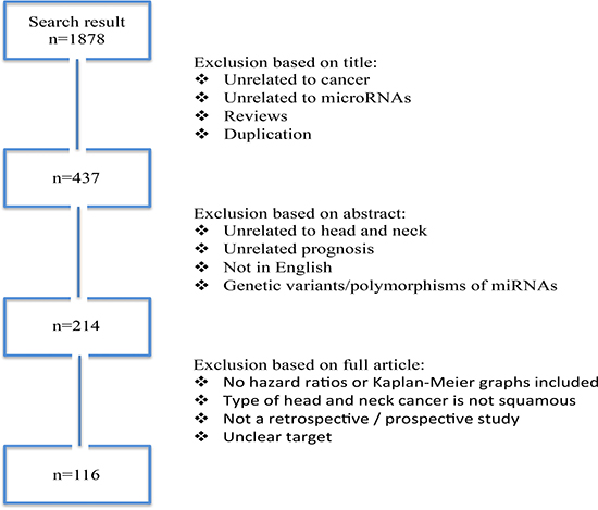The exclusion criteria involved non-English papers, case reports, letters, and reviews. We also excluded cross-sectional studies that addressed associations with tumor stage, tumor histology, tumor size, tumor differentiation, or malignant potential without specifically examining associations with clinical outcome. Expression studies of individual preselected candidate miRNAs or studies using only cell lines were excluded. Papers that fulfilled the criteria were processed for data extraction and the disagreements were resolved by discussion.