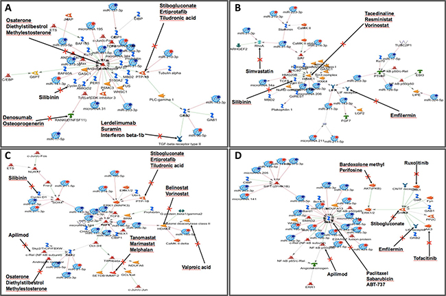 Finally, considering that these 53 miRNAs are related to prognosis, we searched for drugs interfering with the networks using MetacoreTM. We found 30 drugs acting in 32 proteins in the four networks identified (Supplementary Table 3, Figure 6). Proteins targeted by the drugs include AR (Osaterone, Diethylstilbestrol and Methylestosterone), TGF-B (Lerdelimumab, Suramin, and Interferon beta), PTP-1B (Ertiprotafib, Stibogluconate and Tiludronic acid), TNFSF11 (Denosumab and Osteoprogenerin), CCND1 (Silibinin) (Figure 6A); HDAC1 (Tacedinaline, Resministat, and Vorinostat), RhoA (Simvastatin), LIFR (Emfilermin) (Figure 6B); HDAC4 (Belinostat and Vorinostat), MMP2 (Tanomastat, Marimastat and Melphalan), c-Rel (Apilimod), Histone deacetylase (Valproic acid) (Figure 6C); BCL2 (ABT-737, Paclitaxel, and Sabarubicin), AKT (Bardoxolone methyl and Perifosine), PTP-1B (Stibogluconate), JAK1 (Ruxolitinib) and JAK 3 (Tofacitinib) (Figure 6D). The complete list of potential drugs acting in proteins regulated by the microRNAs in head and neck cancer and their function is presented in Supplementary Table 3.