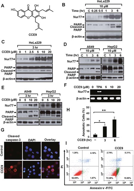 Figure 1: CCE9 induces Nur77 expression and apoptosis. (A) Structure of CCE9. (B) Time-course analysis of Nur77 and PARP cleavage induction by CCE9. HeLa229 cells treated with 10 μM CCE9 for the indicated time were determined by Western blotting using anti-Nur77 antibody. (C) Dose dependent effect of CCE9. HeLa229 cells treated with vehicle or indicated concentration of CCE9 for 3 hr were analyzed for Nur77 expression and PARP cleavage by Western blotting. (D) Time-course analysis of Nur77 expression and apoptosis induction by CCE9 in A549 and HepG2 cells. Cells treated with 10 μM CCE9 for the indicated time were analyzed for Nur77 expression and PARP cleavage by Western blotting. (E) Dose-dependent induction of Nur77 and apoptosis by CCE9 in A549 and HepG2 cells. Cells treated with vehicle or the indicated concentration of CCE9 for 3 hr were analyzed for Nur77 expression and PARP cleavage by Western blotting. (F) RT-PCR analysis of Nur77 mRNA expression in HeLa229 cells. Cells treated with vehicle, TPA (100 ng/ml), or indicated concentration of CCE9 for 3 hr. Nur77 and β-actin mRNA products were simultaneously amplified in the same reaction system, in which β-actin expression level served as an internal control. (G) Caspase-3 activation by CCE9. HeLa229 cells were treated with 10 μM CCE9 for 3 hr, immunostained with antibody recognizing the cleaved caspase-3. Nuclei were visualized by co-staining with DAPI. (H) DAPI staining. HeLa229 cells were treated with CCE9 (10 μM) or vehicle for 3 hr or 6 hr and subjected to DAPI staining. Apoptotic cells were scored and compared between different treatments. *, P<0.01 (VS. control); **, P<0.01 (VS. control). (I) The apoptotic effect of CCE9. HeLa229 cells were treated with vehicle or 10 μM CCE9 for 6 hr and stained with Annexin V/PI. Apoptosis was analyzed by fluorescence-activated cell sorting analysis.