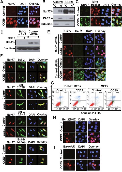 Figure 3: CCE9 induces Nur77 mitochondrial targeting, Bcl-2 colocalization, and Bcl-2 conformational change. (A) CCE9 induces cytoplasmic localization of Nur77. HeLa229 cells treated with 10 μM CCE9 for 2 hr were subjected to immunostaining with anti-Nur77 antibody. Cells were co-stained with DAPI to visualize the nuclei. (B) Cellular fractionation. Nuclear and cytoplasmic fractions were prepared from HeLa229 cells treated with 10 μM CCE9 for 2 hr, subjected to Western blotting analysis. The purity of cellular fraction was confirmed by using anti-PARP and anti-Tubulin antibodies. (C) Nur77 mitochondrial targeting. HeLa229 cells treated with 10 μM CCE9 for 2 hr, Nur77 expression was immunostained with anti-Nur77 antibody and analyzed by confocal microscopy. Cells were co-stained with Mitotraker to recognize the mitochondria and with DAPI to visualize the nuclei. (D-E) The effect of Bcl-2 siRNA transfection on Nur77 cytoplasmic localization. HeLa229 cells transfected with Bcl-2 siRNA or control siRNA for 48 hr and subsequently treated with CCE9 for 2 hr were examined for Bcl-2 expression by Western blotting (D) or subcellular localization of Nur77 by immunostaining (E) Cells were co-stained with DAPI to visualize the nuclei. (F) Co-localization of Nur77 with Bcl-2 mutants. Bcl-2-depleted HeLa cells were transfected with Nur77 and the indicated Bcl-2 or mutants for 24 hr and subsequently treated with CCE9 for 3 hr. Subcellular localization of Nur77 and Bcl-2 was examined by immunostaining. (G) The apoptotic effect of CCE9 is impaired in Bcl-2 knockout MEFs. MEFs or Bcl-2-/- MEFs were treated with vehicle or 10 μM CCE9 for 6 hr and stained with Annexin V/PI. Apoptosis was analyzed by fluorescence-activated cell sorting analysis. (H) Bcl-2 conformational change. HeLa229 cells treated with 10 μM of CCE9 for 2 hr were examined for Bcl-2 conformational change by anti–Bcl-2(BH3) antibody. Cells were also stained with DAPI to visualize the nucleus. (I) Bax activation. HeLa229 cells treated with 10 μM of CCE9 for 2 hr were examined for Bax activation by conformation-sensitive anti-Bax antibody, Bax (6A7). Cells were also stained with DAPI to visualize the nucleus.