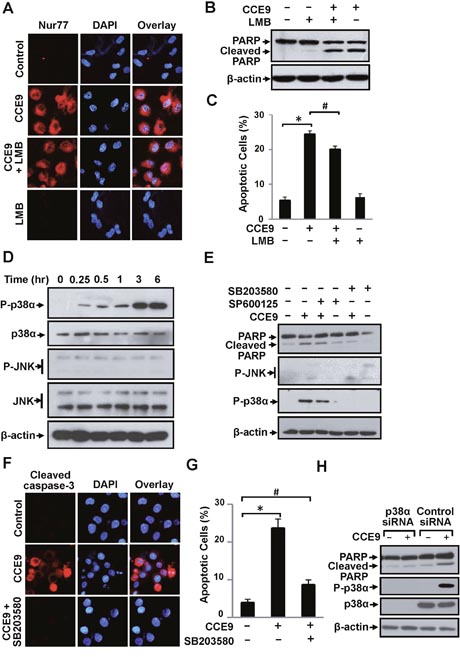 Figure 4: p38α MAPK activation by CCE9 is required for apoptosis and Nur77 expression. (A) LMB fails to block CCE9-induced Nur77 cytoplasmic localization. HeLa229 cells treated with 10 μM of CCE9 in the presence or absence of LMB (1 ng/mL) for 2 hr were examined by immunostaining using anti-Nur77 antibody. (B-C) Effect of LMB on apoptosis induction by CCE9. HeLa229 cells treated with 10 μM CCE9 in the presence or absence of LMB (1 ng/mL) for 3 hr were studied for apoptosis by PARP cleavage by Western blotting (B) and DAPI staining, *, P < 0.01 (vs. control); #, P>0.05 (vs. CCE9 treatment) (C). (D) Induction of p38 MAPK activation by CCE9. HeLa229 cells treated with 10 μM CCE9 for 0, 0.25, 0.5, 1, 3, 6 hr were analyzed for activation of p38 MAPK and JNK by Western blotting using antibody recognizing phosphorylated (P-) p38 MAPK or JNK. Total p38 MAPK and JNK was used as loading control. (E) Role of CCE9 activation of p38 MAPK in PAPR cleavage. HeLa229 cells treated for 3 hr with 10 μM CCE9 in the presence or absence of 25 μM SB203580 or SP600125 were analyzed by Western blotting. (F-G) Effect of SB203580 on CCE9 apoptotic activities. HeLa229 cells treated for 3 hr with 10 μM CCE9 in the presence or absence of 25 μM SB203580 were examined by for caspase-3 activation by immunostaining with antibody recognizing the cleaved caspase-3 (F) and apoptosis by DAPI staining, *, P < 0.01 (vs. control); #, P>0.05 (vs. control) (G). (H) Effect of p38α MAPK siRNA transfection on CCE9 apoptotic activities. HeLa229 cells transfected with p38α MAPK siRNA or control siRNA for 48 hr, and treated with 10 μM CCE9 for 3 hr were analyzed by Western blotting were analyzed by Western blotting.
