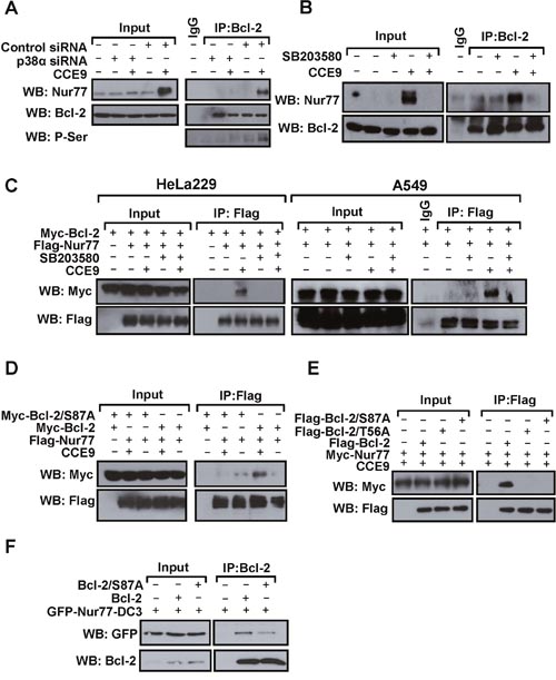 Bcl-2 phosphorylation by p38α MAPK is mainly mediated by multiple phosphorylation sites in its loop region. As the loop of Bcl-2 is responsible for Bcl-2 interaction with Nur77 and subsequently Bcl-2 conversion, we studied whether CCE9 activation of p38α MAPK was involved in the regulation of Bcl-2 interaction with Nur77. Co-immunoprecipitation assays demonstrated that Nur77 induced by CCE9 treatment was co-immunoprecipitated together with phosphorylated Bcl-2 by anti-Bcl-2 antibody (Figure 6A), demonstrating their interaction. Such an interaction was not observed in cells transfected with p38α MAPK siRNA (Figure 6A) or treated with SB203580 (Figure 6B), likely due to their inhibition of Nur77 expression and Bcl-2 phosphorylation. To exclude the effect of p38α MAPK inhibition on Nur77 expression, we studied the interaction of transfected Nur77 and Bcl-2. Thus, Myc-tagged Bcl-2 and Flag-tagged Nur77 were co-transfected into HeLa229 cells, and their interaction in the presence or absence of CCE9 was examined. Co-immunoprecipitation assays showed that transfected Flag-Nur77 and Myc-Bcl-2 strongly interacted when cells were treated with CCE9 in both HeLa229 and A549 cells (Figure 6C). However, when cells were co-treated with SB203580, which did not affect the expression of transfected Flag-Nur77, CCE9-induced Nur77-Bcl-2 interaction was strongly inhibited (Figure 6C). Thus, CCE9-induced Nur77 interaction with Bcl-2 likely involved its phosphorylation of Bcl-2 through its activation of p38α MAPK. To further characterize the role of Bcl-2 phosphorylation in its interaction with Nur77, Ser87 and T56 in the loop of Bcl-2, which was shown to be phosphorylated by p38α MAPK [23], were mutated into Ala. When Bcl-2/S87A, in which Ser87 was substituted with Ala, was analyzed for its interaction with Nur77 in HeLa229 cells, it failed to interact with Nur77 in cells treated with CCE9, while Bcl-2 strongly interacted with Nur77 under the same conditions (Figure 6D). CCE9 also showed much reduced effect on inducing Nur77 interaction with Bcl-2/S87A and another Bc-2 mutant with Thr56 substituted with Ala (Bcl-2/T56A) in Bcl-2-depleted HeLa cells, as compared to its inducing effect on Nur77 interaction with wild-type Bcl-2 (Figure 6E). Interaction of Nur77-DC3, a Nur77 mutant that constitutively resides in the cytoplasm to interact with Bcl-2 [7, 15], with Bcl-2/S87A was also reduced when compared to its binding to the wild-type Bcl-2 (Figure 6F). Together, these results demonstrate that p38α MAPK phosphorylation of Bcl-2 at Ser87 and Thr56 plays an important role in its interaction with Nur77.