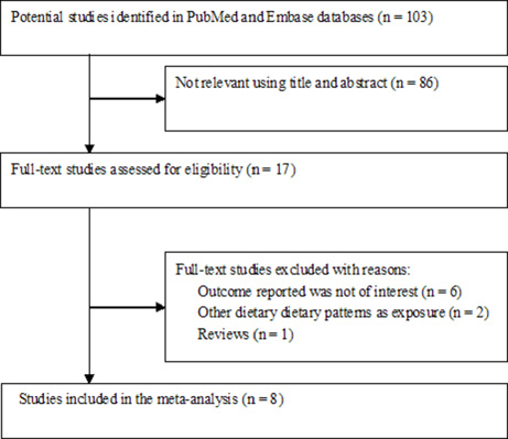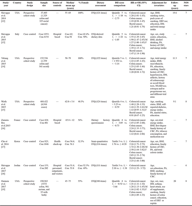 Studies meeting the following inclusion criteria were included: 1) all cohort and case–control studies that reported on the association of the inflammatory potential of diets, as estimated by DII score, with CRC risk and 2) those that provided the multivariable-adjusted RR, hazard ratio (HR), or odds ratio (OR) with corresponding 95% confidence intervals (CI) of CRC for the highest DII score (highest pro-inflammatory diets) versus the lowest DII score (lowest pro-inflammatory diets).