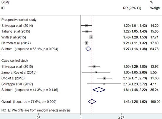 Figure 2: Forest plots showing RR with 95% CI of colorectal cancer comparing the highest to the lowest dietary inflammatory index score.