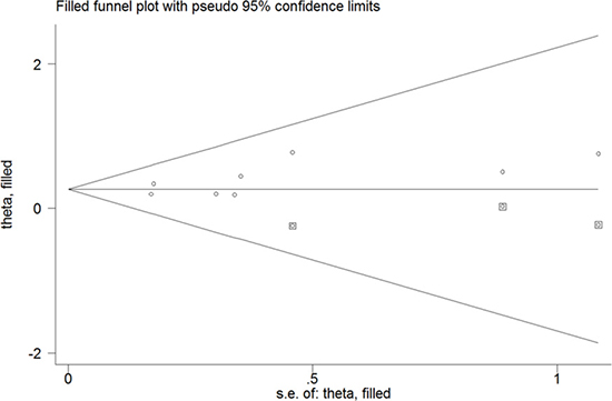 Figure 3: Funnel plot of dietary inflammatory index score with colorectal cancer risk. The circles alone are real studies and the circles enclosed in boxes are ‘filled’ studies.