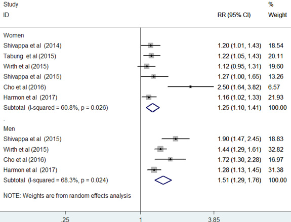 Figure 4: Forest plots showing gender specific RR with 95% CI of colorectal cancer comparing the highest to lowest dietary inflammatory index score.