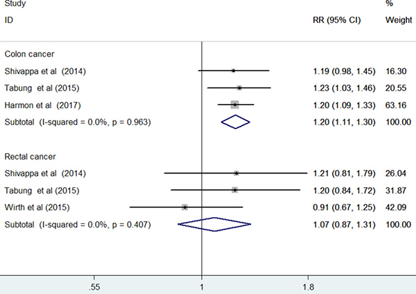 Figure 6: Forest plots showing RR with 95% CI of colon cancer and rectal cancer comparing the highest to lowest dietary inflammatory index score in prospective cohort studies.