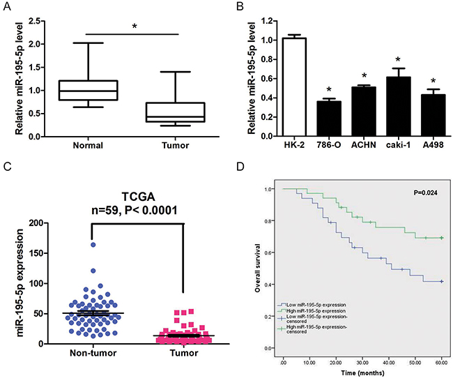 Figure 1: miR-195-5p was downregulated in RCC. (A) Relative miR-195-5p expression levels in 67 paired RCC tumor tissues and matched normal tissues as determined by qRT-PCR. (B) Relative miR-195-5p levels in 4 different RCC cell lines and the immortalized primary human proximal tubular cell line HK-2 as determined by qRT-PCR. U6 was used as internal control. (C) Downregulation of miR-195-5p in RCC tissues confirmed by TCGA database (n=59, P<0.0001). (D) Kaplan-Meier survival rates for RCC patients with low and high miR-195-5p expression. The data are presented as mean ± SD of 3 independent experiments. *P < 0.05
