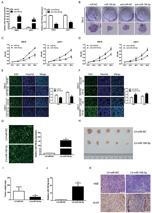 Figure 2: miR-195-5p suppressed RCC cell growth in vitro and xenograft tumor growth in vivo. (A) 786-O and caki-1 cells were transfected with miR-195-5p mimics (miR-195-5p) or inhibitors (anti-miR-195-5p), and their negative controls (miR-NC or anti-miR-NC). The relative miR-195-5p levels were determined by qRT-PCR following 48 h of culture. (B) Colony formation of 786-O cells following transfection of miR-195-5p mimics or inhibitor. (C and D) The effects of miR-195-5p mimics (C) or inhibitors (D) on 786-O and caki-1 cells proliferation as demonstrated by the MTT assay. (E and F) The effects of miR-195-5p mimics (E) or inhibitors (F) on 786-O and caki-1 cells proliferation as demonstrated by the EdU proliferation assay. The cells with green fluorescence are in the S phase of mitosis, and the cells with blue fluorescence represent the entire cell population. (G) 786-O cells were infected with miR-195-5p overexpressing lentivirus (LV-miR-195-5p) or the negative control lentivirus (LV-miR-NC). The images were captured using a fluorescence microscope at a magnification of 100×, and the relative miR-195-5p expression was evaluated by qRT-PCR. (H and I) Following infection with LV-miR-195-5p or LV-miR-NC, 786-O cells were implanted subcutaneously in 6-week-old nude mice. The tumor growth was evaluated following 3 weeks of the tumor implantation. Representative images (H) and weight (I) of the excised tumors derived from nude mice are shown. (J) The relative miR-195-5p levels in xenograft tumors as determined by qRT-PCR. (K) Representative images of H&E staining and Ki-67 immunohistochemical detection of the excised tumors derived from nude mice. Scale bar = 100 μ m. Data are shown as mean ± SD of 3 independent experiments. *P < 0.05
