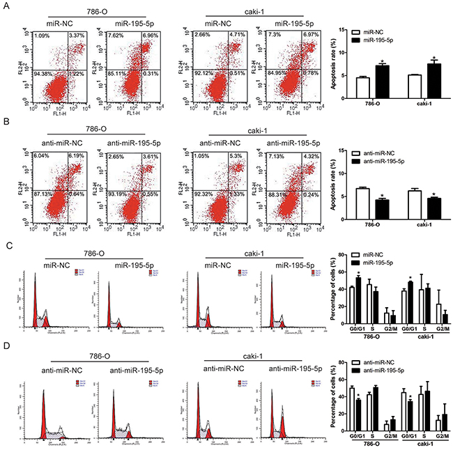 Figure 3: miR-195-5p induced apoptosis and cell cycle arrest in RCC. (A and B) Apoptosis of 786-O and caki-1 cells as measured by flow cytometry following miR-195-5p overexpression (A) or suppression (B). (C and D) The effects of miR-195-5p mimics (C) or inhibitors (D) on the cell cycle distribution of 786-O and caki-1 cells as determined by flow cytometry. The data are presented as mean ± SD of 3 independent experiments. *P < 0.05