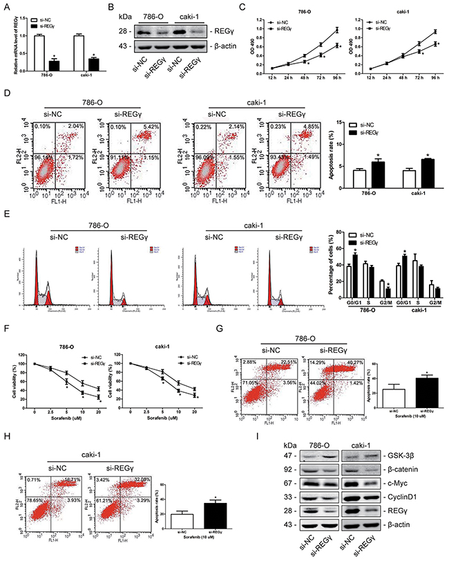 Figure 6: Knockdown of REGγ inhibited proliferation and increased chemosensitivity to sorafenib by suppressing the wnt/β-catenin pathway in RCC cells. (A and B) 786-O and caki-1 cells were transfected with si-REGγ or si-NC. The relative mRNA levels (A) and the protein expression (B) of REGγ were determined by qRT-PCR and Western blot analysis, respectively. (C) The proliferation of 786-O and caki-1 cells was analyzed by the MTT assay following REGγ knockdown. (D) The apoptosis rate of 786-O and caki-1 cells was determined by flow cytometry following REGγ knockdown. (E) The cell cycle distribution of 786-O and caki-1 cells was measured by flow cytometry following REGγ knockdown. (F) 786-O and caki-1 cells were transfected with si- REGγ or si-NC, and further cultured with sorafenib at various concentrations of 0, 2.5, 5, 10, 20 μM. Following 24 h of sorafenib treatment, cell viability was determined by the MTT assay. (G and H) 786-O and caki-1 cells were transfected with si-REGγ or si-NC, further treated with sorafenib at the concentration of 10 μM for 24 h, and apoptosis was measured by flow cytometry. (I) Western blot measurement of GSK-3β, β-catenin, c-Myc and Cyclin D1 protein expression levels following knockdown of REGγ in 2 RCC cells. β-actin was used as an internal control. The data are presented as mean ± SD of 3 independent experiments. *P < 0.05